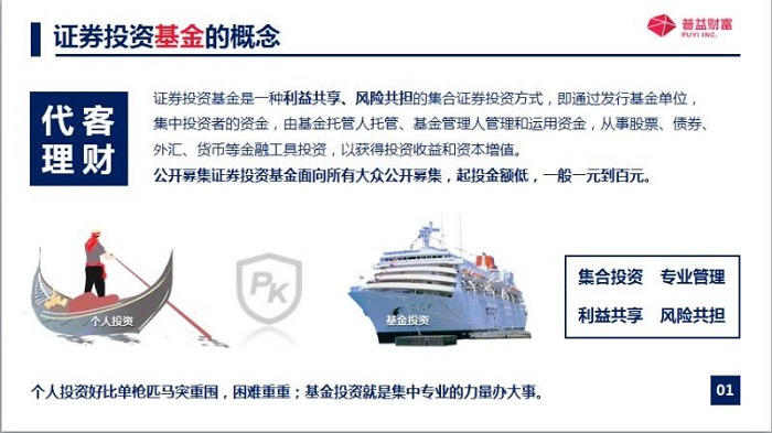把這些資金呢投資于股票債券外匯貨幣等金融工具的一種集合投資方式,也就是說不止投資單一只股票,也不止投資單一只債券,而是投資多只股票或者多只債券的一種集合投資方式,極大地分散的風險,因為咱們都知道雞蛋不能放在同一個籃子里面,并且呢,公募基金是面向所有大眾公開募集的,起投金額是比較低的,一元起投呀,百萬元起投呀,千元起投。這對于很多投資者來說呢,都是可以接觸的到的,那如果說拿個人投資跟基金投資進行比較的話,就像在海里面航行一樣,個人投資就像一個孤身備戰的小姑船一樣,那基金投資,因為它背后有一整個團隊進行運作,那他的專業非常強,所以呢,它就是集中專業的力量辦大事。