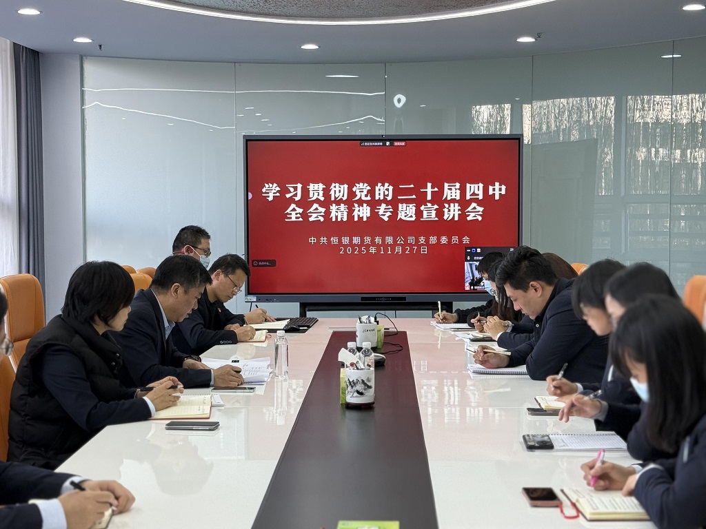 2025年11月27日,恒銀期貨有限公司在總部會議室設(shè)立主會場,召開學習貫徹黨的二十屆四中全會精神宣講報告會。河北國富投資副總經(jīng)理、恒銀公司黨支部書記、董事長李剛作專題宣講,公司全體黨員和積極分子現(xiàn)場參會,公司外地黨員及從業(yè)人員通過線上會議同步學習。