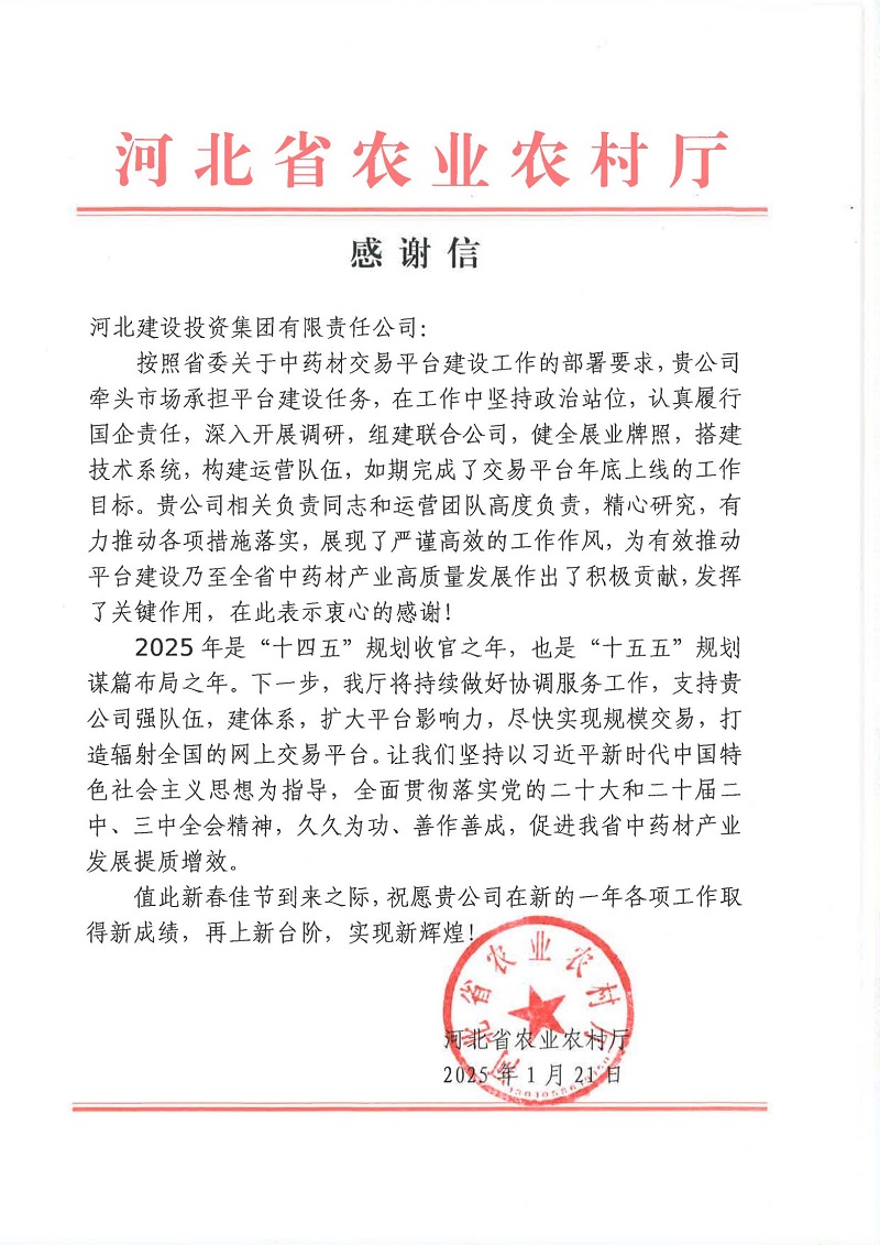近日,河北省農業農村廳向河北建投集團發來感謝信,高度贊揚河北建投集團在河北省中藥材交易平臺建設工作中所展現出的責任擔當與卓越貢獻。